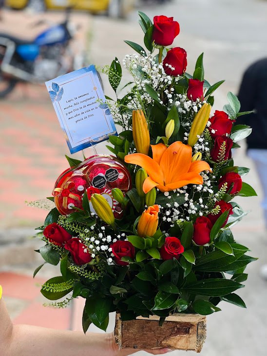 Sorprende a esa persona especial con este vibrante arreglo que combina la elegancia de las rosas con la frescura de los lirios y caja de chocolates. Presentado en una base rústica de madera, es el regalo perfecto para celebrar un cumpleaños.