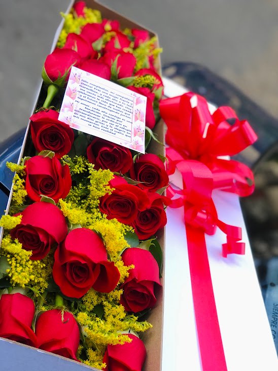 elebra el amor verdadero con este exclusivo arreglo de rosas rojas de primera calidad, cuidadosamente seleccionadas para expresar pasión y admiración profunda. Presentadas en una elegante caja alargada y acompañadas de un delicado toque de solidago amarillo, este detalle busca sorprender en esos momentos especiales.