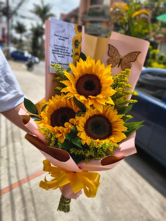 Sorprende con este vibrante ramo de girasoles frescos, envuelto en papel rosa pastel y decorado con una delicada mariposa. Incluye una tarjeta personalizable para enviar un mensaje especial. Perfecto para demostrar cariño y alegría.