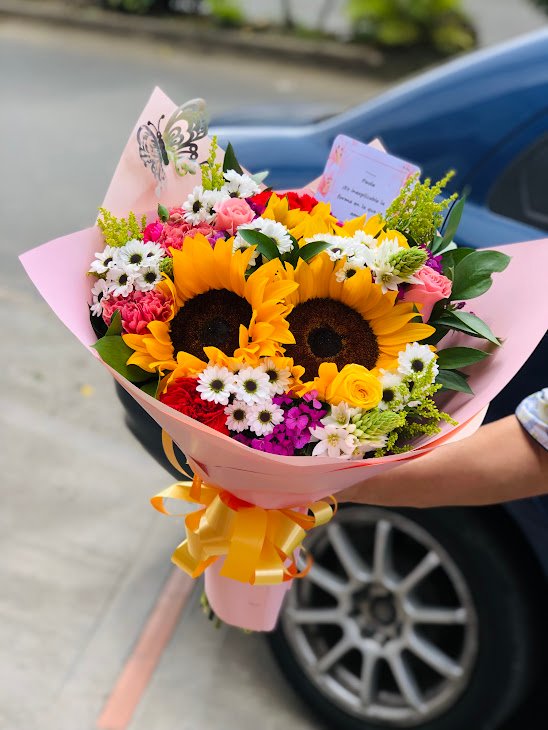 Ramo compuesto por flores mixtas frescas de vibrante colores, realzados por sutiles toques de solidago y follaje verde. El arreglo está delicadamente envuelto en papel premium , decorado con mariposas y un lazo rosa vibrante. Incluye una tarjeta personalizada para mensajes especiales.